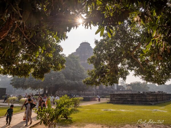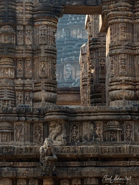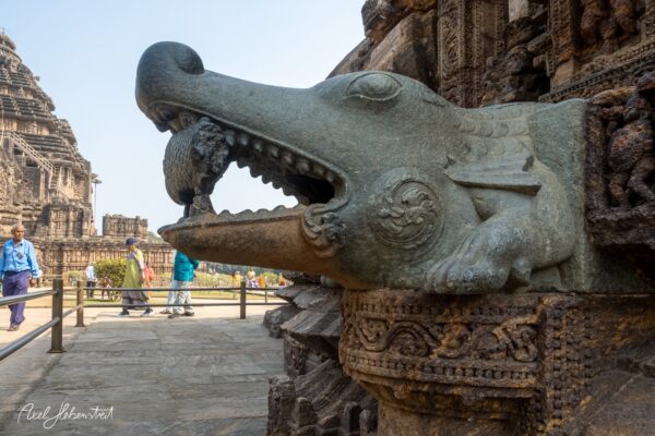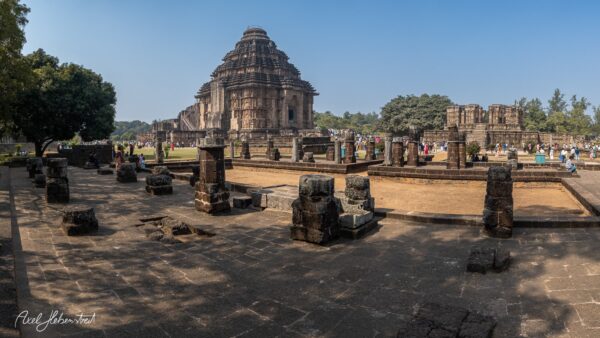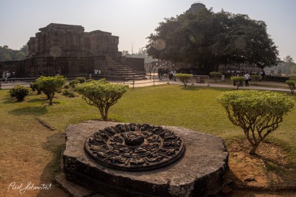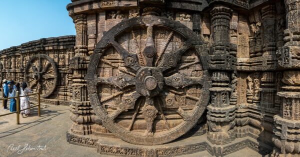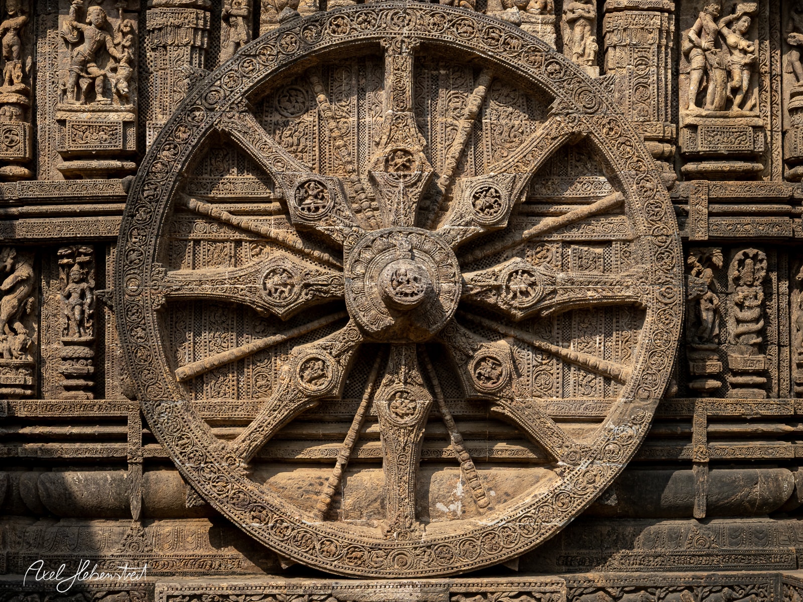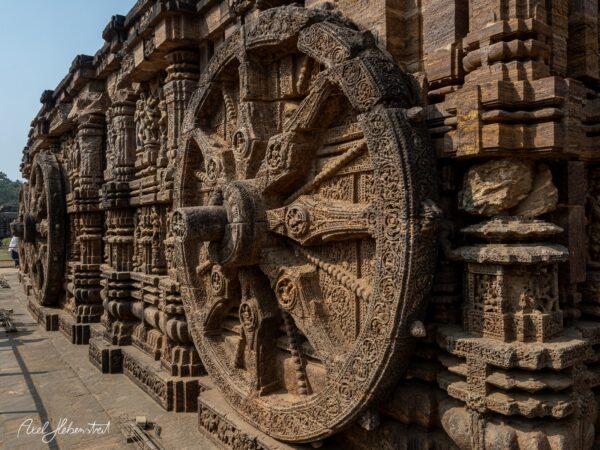Der Sonnentempel von Konark ist ein hinduistischer Tempel aus dem 13. Jahrhundert, nahe der Küste von Odisha in Indien. Die gesamte Anlage ist wie ein riesiger Streitwagen gestaltet, mit insgesamt 24 steinernen Rädern. Jedes Rad hat einen Durchmesser von etwa 3 Metern und acht Speichen. Was heute noch erhalten ist, wirkt trotz allem enorm beeindruckend – auch wenn der höchste Teil nur noch die Versammlungshalle ist. Das angrenzende Hauptheiligtum (Vimana) war einst deutlich höher und soll rund 70 Meter erreicht haben.